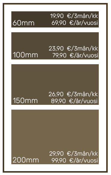 Hinnat alkavat 19,90 € ylöspäin per 3 kuukautta lokeron koosta riippuen. 12 kuukauden sopimuksella saatte edullisemman hinnan. Sopimukset uusitaan automaattisesti, ellei niitä irtisanota. Kaikki hinnat sisältävät arvonlisäveron 25,5 %.